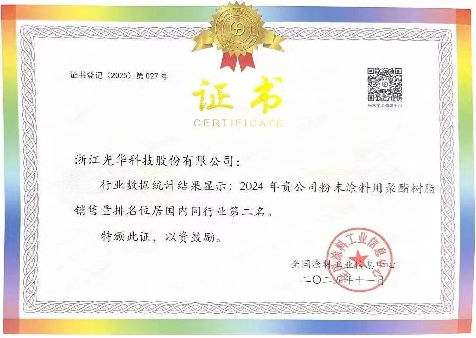光华股份一直专注于粉末涂料用聚酯树脂的研发、生产和销售,本次销量排名,是行业对光华股份市场地位与产品质量的高度认可,进一步印证了公司在行业内的领先地位和持续竞争力。