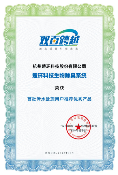 杭州楚环科技股份有限公司旗下产品“楚环科技生物除臭系统”榜上有名,和其他28款优质产品一起荣膺“首批污水处理用户推荐优秀产品”。