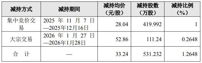 同日晚间,四川黄金还披露了5%以上的公司第三大股东的减持情况。四川黄金称,公司于近日收到北京金阳矿业投资有限责任公司(下简称北京金阳)出具的《减持计划期间届满告知函》,北京金阳在2025年11月7日~2026年1月28日通过集中竞价和大宗交易方式合计减持了531.232万股,占公司总股本的1.2648%。减持价格区间为27.08 元/股~55.92元/股。