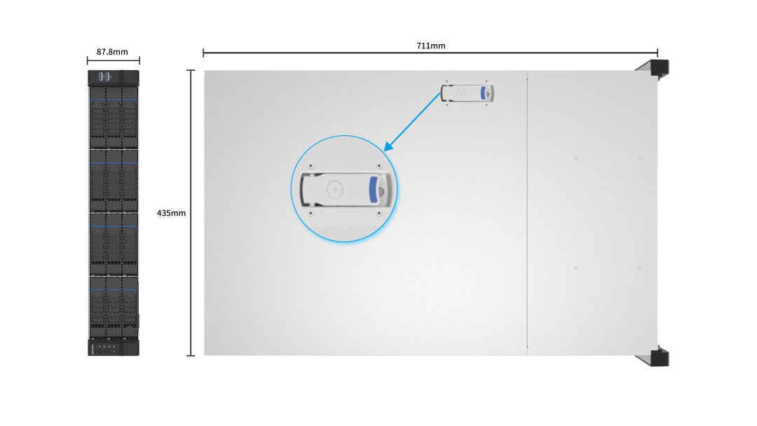 智微智能 SYS-80215R 2U机架式高性能服务器的整机尺寸为435mm(宽)*87.8mm(高)* 711mm(深)。服务器内部配备两个挡风罩,可以优化散热气流,提高散热效率。前后面板设计简单易用,没有复杂按键,操作简单。服务器顶部配备一键拆卸开关,便于用户更换设备和进行运维,无需重复锁螺。