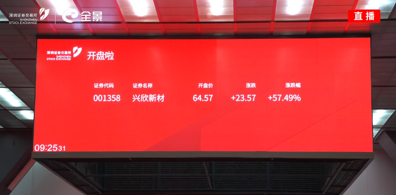 行情信息显示,兴欣新材上市首日开盘大涨57.49%,报64.57元/股。