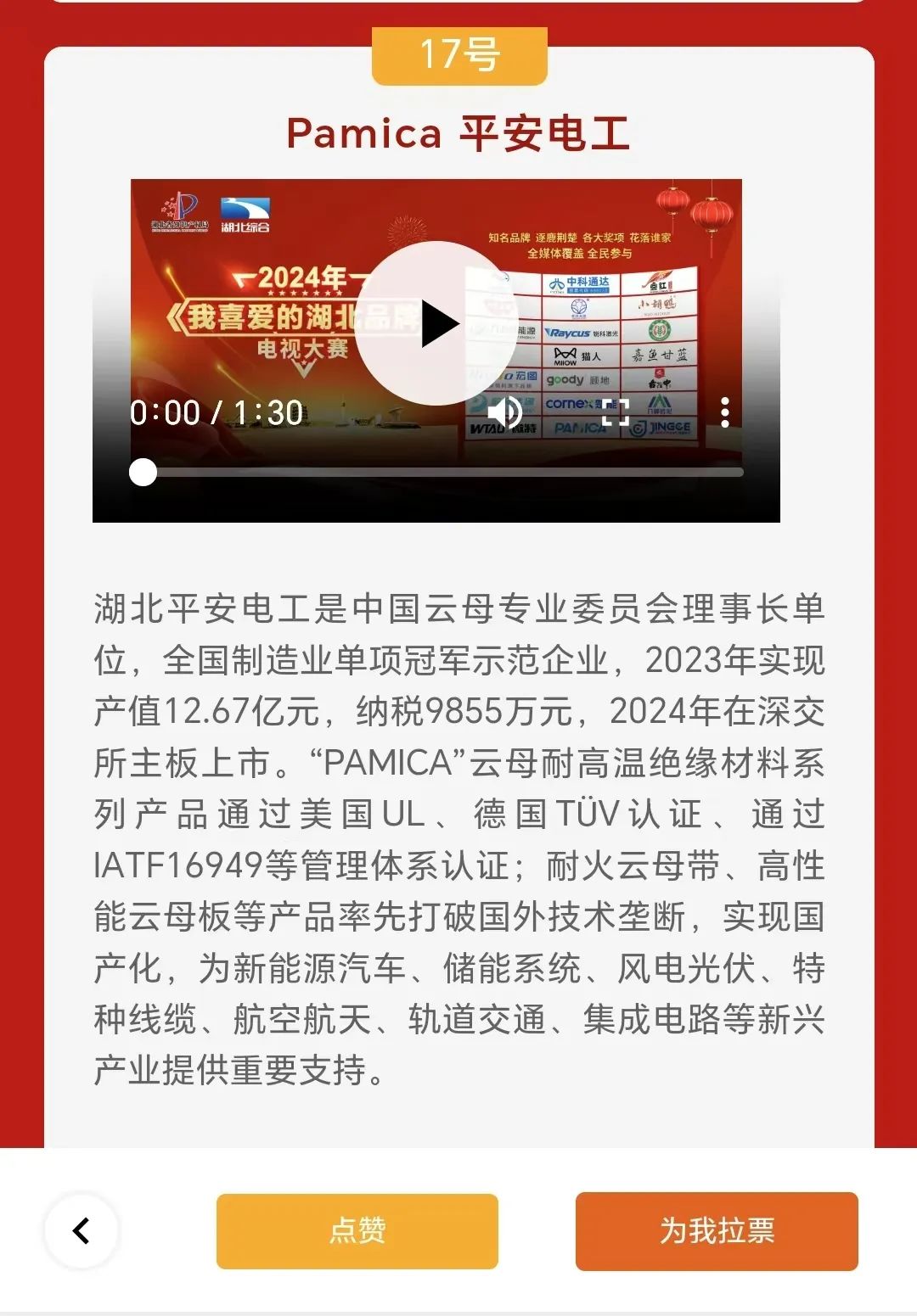 近日,由省知识产权局、省发改委与湖北广播电视台联合主办的2024年“我喜爱的湖北品牌”电视大赛正式进入网络投票阶段。在这场汇聚湖北精英品牌的盛会上,共有21个来自湖北的杰出品牌脱颖而出,晋级决赛。湖北平安电工科技股份公司成功入选并晋级决赛,与其他20个优秀品牌共同角逐年度金奖与银奖的桂冠。让我们共同关注、积极参与,一起为家乡品牌赋能、为家乡品牌点赞喝彩!