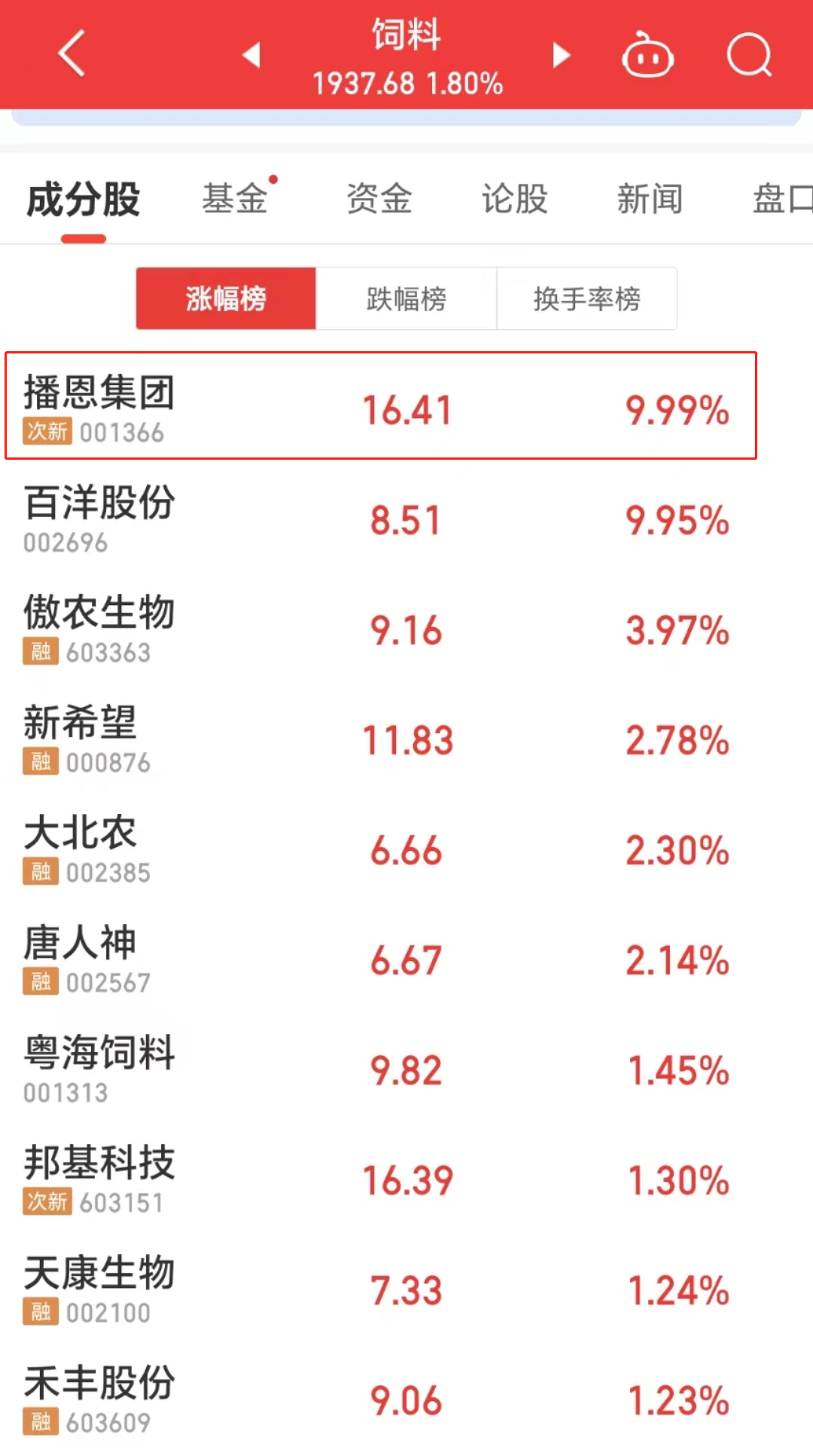 8月25日,饲料股、猪肉股直线上攻,播恩集团股票涨停,截止10点,报16.41元。