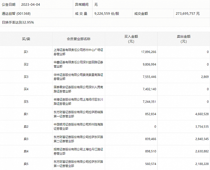 4月4日,通达创智今日涨停,龙虎榜数据显示,上榜营业部席位全天成交6913.4万元,占当日总成交金额比例为25.26%。其中,买入金额为5305.66万元,卖出金额为1607.74万元,合计净买入3697.92万元。