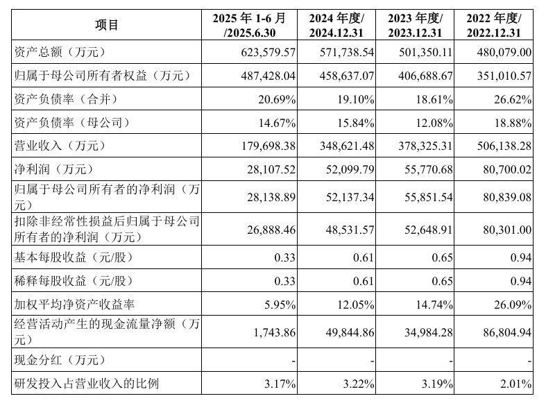 财务方面,于2022年度、2023年度、2024年度和2025年1-6月,公司实现营业收入50.61亿元(人民币,下同)、37.83亿元、34.86亿元和17.97亿元;同期,取得净利润8.07亿元、5.58亿元、5.21亿元和2.81亿元。