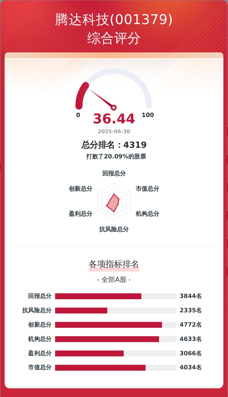 上市公司研究院构建了一套上市公司韧性评价体系,从企业盈利、科技创新、股东回报、经营抗风险、市值表现及机构吸引力六个维度对企业进行量化评分,满分为100分。腾达科技的韧性评价总分为36.44分,在A股5405家可比上市公司中排名第4319位。
