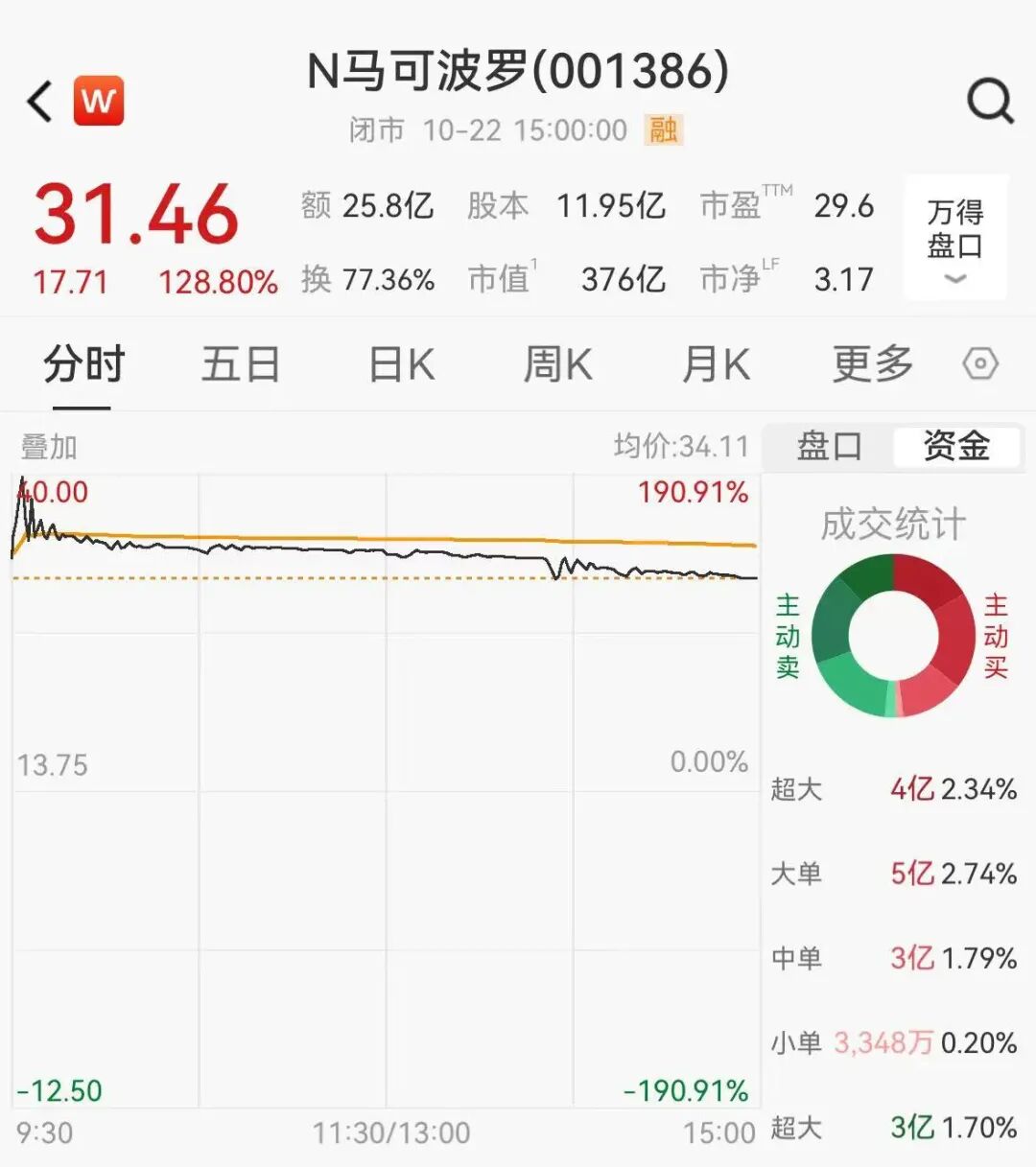 2025年10月22日上午,东莞陶瓷巨头马可波罗控股股份有限公司(股票代码:001386,简称“N马可波罗”)在深圳证券交易所正式挂牌上市。截至当日收盘,公司股价报31.46元,较13.75元的发行价大涨128.80%,总市值攀升至376亿元,成交金额达25.8亿元,换手率高达77.36%,首日表现亮眼。(截至发稿,欧派家居总市值为329亿元)。