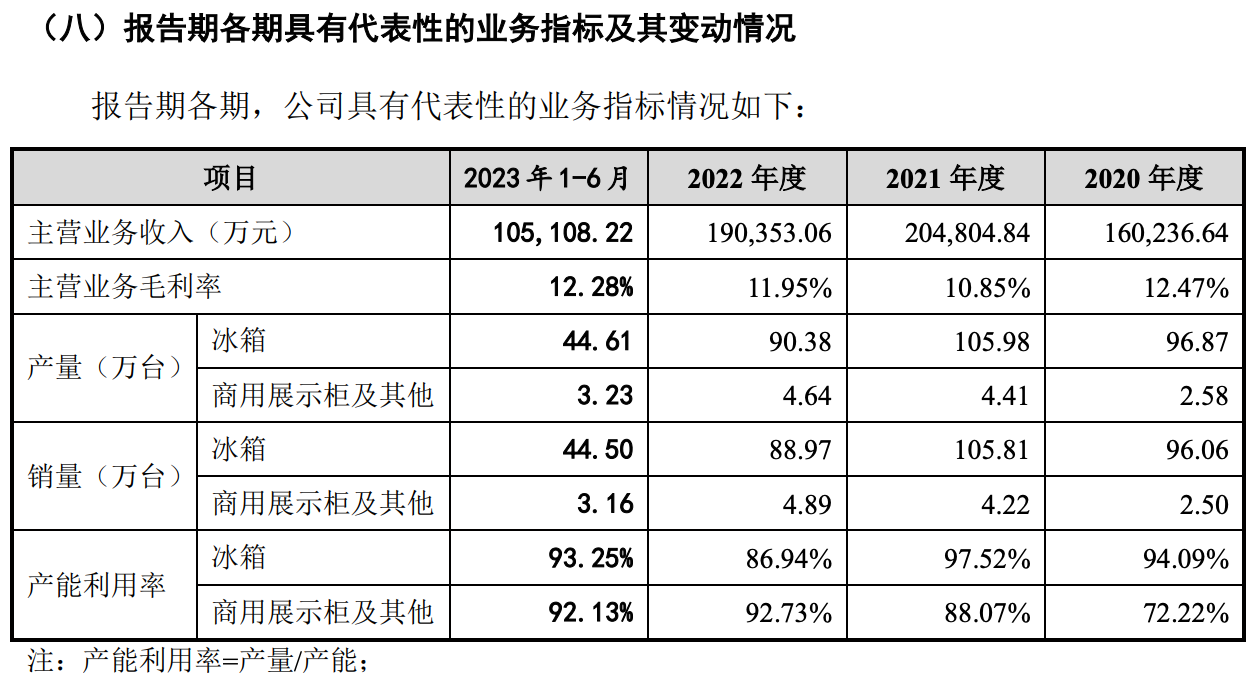 然而年“产100万台嵌入式冰箱等冰箱产品项目”的落地真的能被市场消化吗?根据招股书披露,雪祺电气在2020年至2022年度间,冰箱和商用展示柜等分别产能为96.87和2.58万台、105.98和4.41万台、90.38和4.64万台,所有产品平均每年累计产能不到100万台,而本次IPO募投项目直接扩产能高达100万台,相当于目前产能直接翻倍。