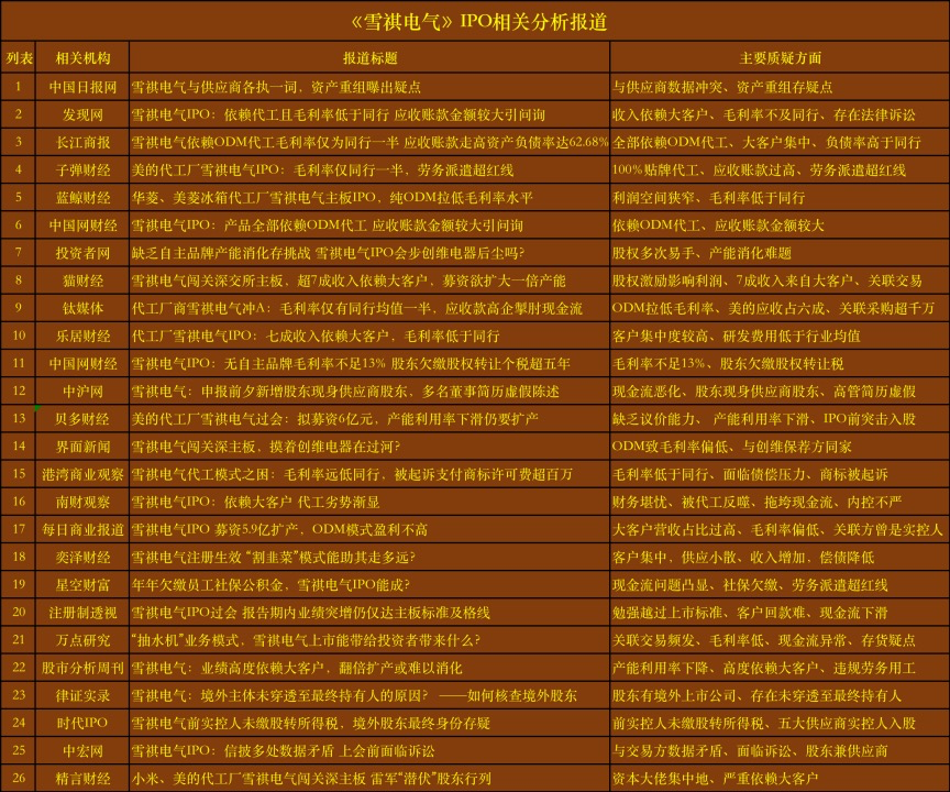然而,作为一家冰箱代工生产的ODM 型企业,雪祺电气IPO之路也是背时市场质疑。财闻网不完全统计,目前市场中有26家媒体机构发文质疑雪祺电气IPO的合理性和经营问题,在市场铺天盖地的质疑声中,包括大客户依赖、关联交易、债务压力、毛利率下降,缺乏溢价能力等方面备受市场关注。