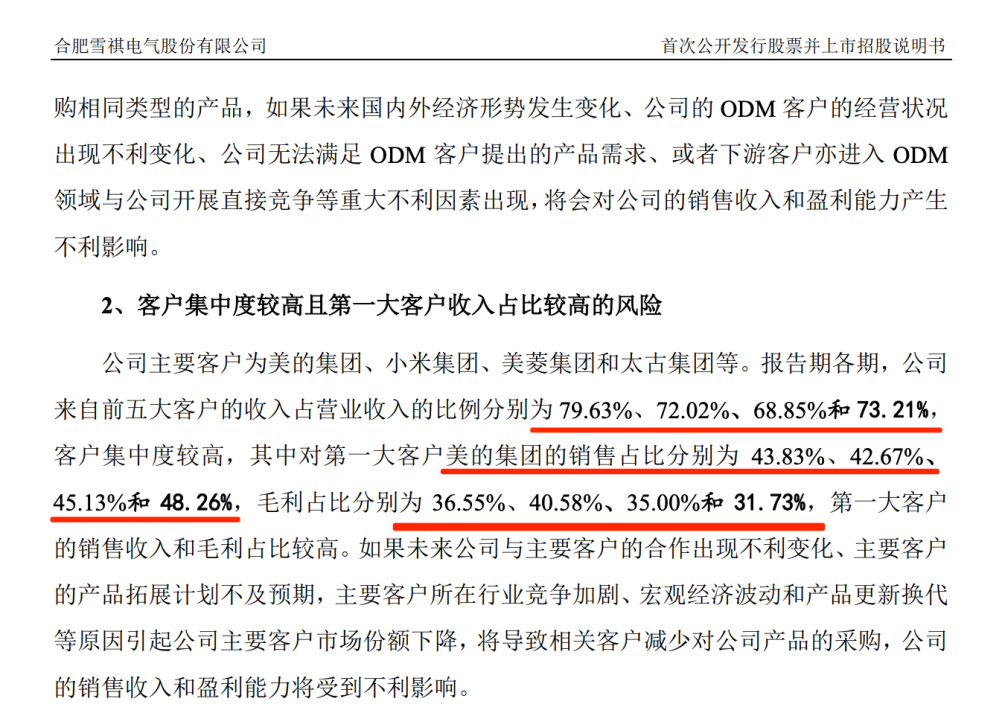 根据招股书披露,雪祺电气目前的主要客户分别为美的、小米、美菱和太古。在2020年至2023年上半年,公司前五大客户的收入占比分别为 79.63%、72.02%、68.85%和 73.21%,可以看出的是雪祺电气客户集中度严重过高。