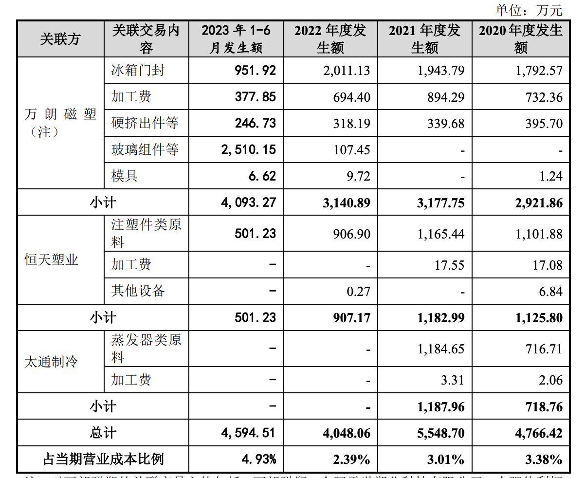 而在关联交易方面,雪祺电气与万朗磁塑、恒天塑业,太通制冷的交易额高达数千万级别,其中尤以万朗磁塑为多。而在2010年度至2023年6月,雪祺电气的委托万朗磁塑加工费分别为5,223.64万元、4,768.07万元、3,909.05万元和1,594.82万元。