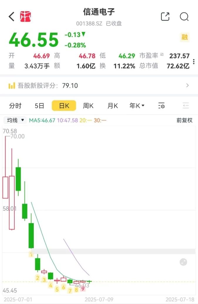 上市首日,股价一度站上70元/股,但上市即巅峰,此后数日连跌,截至7月18日收盘已跌至46.55元/股。