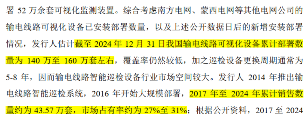 要知道,电网建设是场“马拉松”,招股书里提到的高达130亿元的输电线路智能巡检市场规模,也是多年积累的总量,并非单年度能“瓜分”的蛋糕。