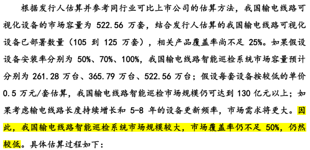当然,故事还有“未来篇”:招股书也指出,当前输电线路智能巡检系统的市场覆盖率还不足50%,理论上未来空间还能翻一倍。