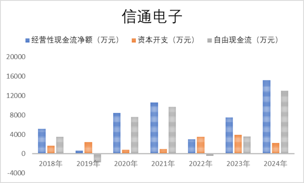 因此,从现金流的角度来说,信通电子的压力并不算大,2018年至2024年,公司依靠经营活动累计赚得现金超5亿元,比同期利润总额少了1.8亿元。