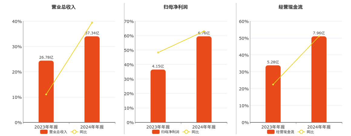 公司营业总收入为37.34亿元。归母净利润为6.76亿元。经营活动现金净流入为7.96亿元。