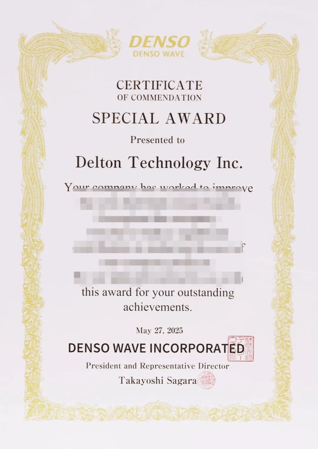 2025年5月27日下午15:00,日本电装集团(DENSO Corporation)旗下子公司DENSO WAVE在名古屋愛知県刈谷市中山町2丁目38番地召开第12届供应商感谢大会。活动邀请75家日本国内外优秀供应商代表齐聚一堂,共同见证这一表彰卓越、凝聚合作的重要时刻。本次DENSO WAVE共颁出四个奖项,广州广合科技股份有限公司在曾红总经理的带领下,凭借在技术创新、成本优化、产品质量、交付效率以及长期稳定合作等多方面的出色表现,从众多供应商中脱颖而出,斩获大会重磅表彰。广合科技作为唯一海外企业斩获最高技术荣誉——SPECIAL AWARD特别贡献奖,并由DENSO WAVE代表取締役社長 Takayoshi Sagara 颁奖,创下DENSO WAVE海外PCB供应商首获此殊荣的里程碑。
