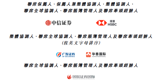 本次发行的联席保荐人、保荐人兼整体协调人、整体协调人、联席全球协调人、联席账簿管理人及联席牵头经办人为中信证券、HSBC,整体协调人、联席全球协调人、联席账簿管理人及联席牵头经办人为广发证券、华泰国际,联席全球协调人、联席账簿管理人及联席牵头经办人为国联证券国际。