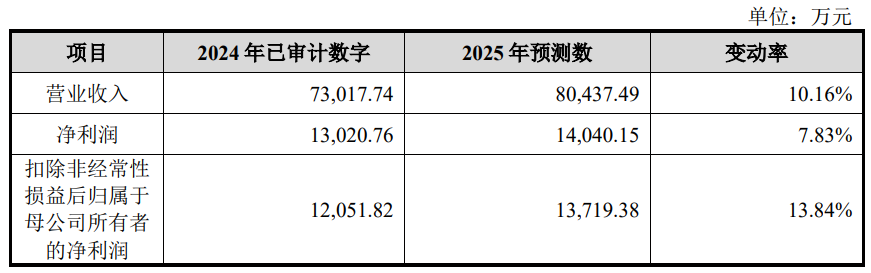 2025年度,誉帆科技预计营业收入为80,437.49万元,同比增长10.16%;预计净利润为14,040.15万元,同比增长7.83%;预计扣除非经常性损益后归属于母公司所有者的净利润13,719.38万元,同比增长13.84%。