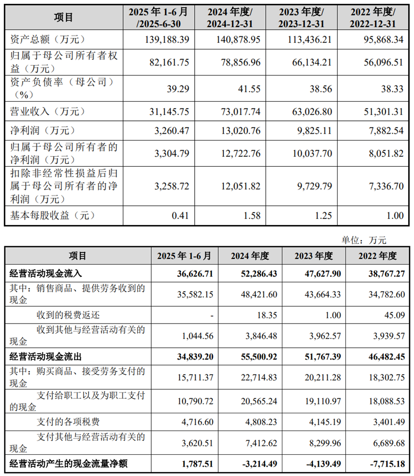 2022年至2024年,公司的营业收入分别为51,301.31万元、63,026.80万元、73,017.74万元;净利润分别为7,882.54万元、9,825.11万元、13,020.76万元;归属于母公司股东的净利润分别为8,051.82万元、10,037.70万元、12,722.76万元;扣除非经常性损益后归属于母公司股东的净利润分别为7,336.70万元、9,729.79万元、12,051.82万元。