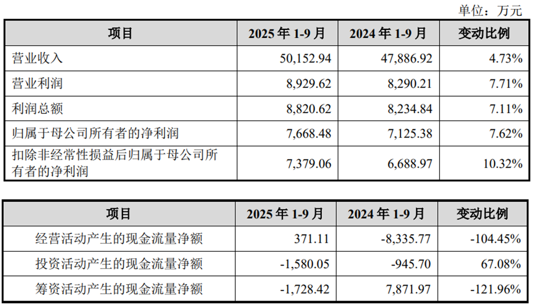 2025年1-9月,公司实现营业收入50,152.94万元,同比增长4.73%;实现归属母公司股东净利润7,668.48万元,同比增长7.62%;扣除非经常性损益后归属母公司股东净利润7,379.06万元,同比增长10.32%;经营活动产生的现金流量净额371.11万元,上年同期为-8,335.77万元。