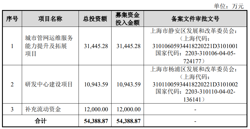 誉帆科技本次发行募集资金总额59,581.17万元,扣除发行费用后的募集资金净额为51,537.68万元,比原计划少2,851.19万元。誉帆科技2025年12月25日披露的招股书显示,公司拟募集资金54,388.87万元,用于城市管网运维服务能力提升及拓展项目、研发中心建设项目、补充流动资金。