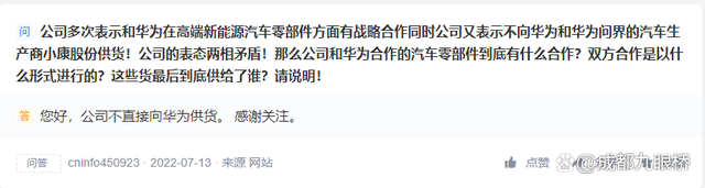 2、宗申动力曾多次表示和华为在高端新能源汽车零部件方面有战略合作同时公司又表示不向华为和华为问界的汽车生产商小康股份供货!公司的表态两相矛盾!那么公司和华为合作的汽车零部件到底有什么合作?双方合作是以什么形式进行的?这些货最后到底供给了谁?请说明!