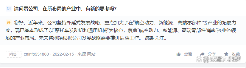 对此,宗申动力表示,公司在巴南区新竞拍的土地用于建设以智能制造为核心的现代化汽车零部件智能生产线,目前处于土地购置、建设方案论证阶段,能够满足公司新老客户的市场需求。近年来,公司航空动力、高端零部件等新兴业务已经实现持续增长,有利于未来公司转型升级的战略布局。