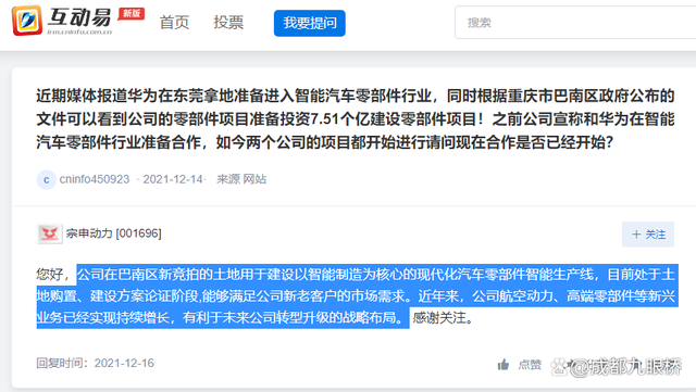 2021年12月,有媒体报道华为在东莞拿地准备进入智能汽车零部件行业,同时根据重庆市巴南区政府公布的文件可以看到公司的零部件项目准备投资7.51个亿建设零部件项目!之前公司宣称和华为在智能汽车零部件行业准备合作,如今两个公司的项目都开始进行请问现在合作是否已经开始?