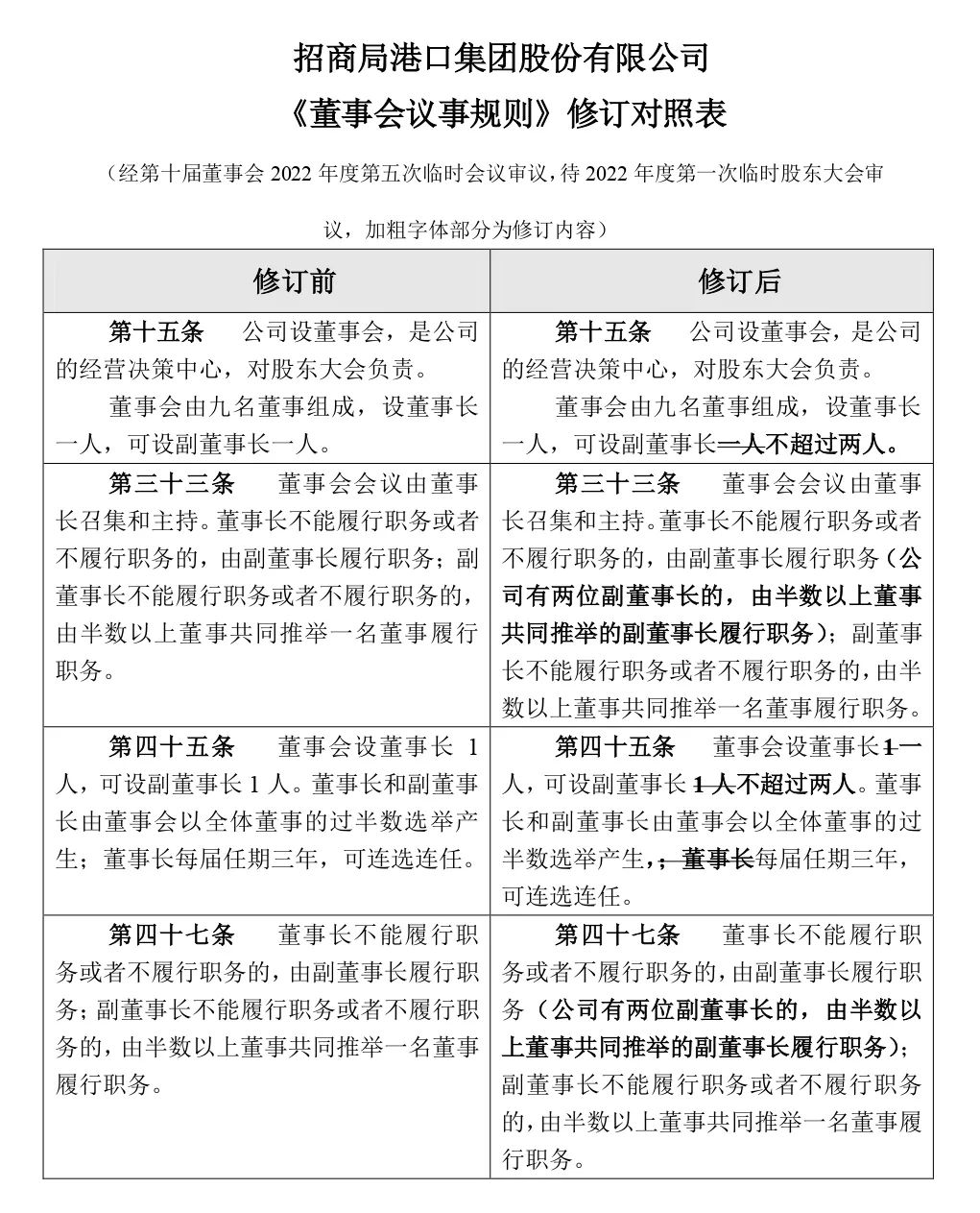 5月16日晚,招商局港口集团股份有限公司(简称“招商港口”,001872)发布了第十届董事会2022年度第五次临时会议决议公告,公告称董事会会议审议通过了《关于修订〈公司章程〉的议案》以及《关于修订〈董事会议事规则〉的议案》。从公告中可见,招商港口修订了有关副董事长的章程与规则,董事会可设不超过两名副董事长。