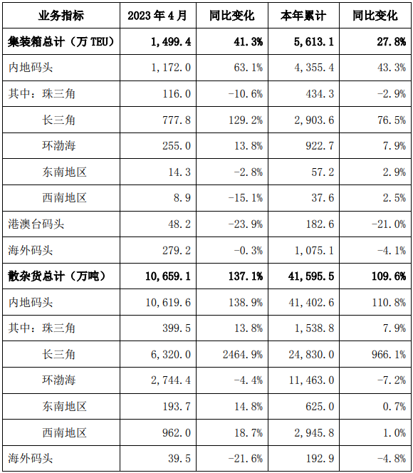 招商港口5月15日公告,2023年4月,集装箱总计1499.4万TEU,同比增长41.3%;散杂货总计10659.1万吨,同比增长137.1%。2023年1月到4月,集装箱总计5613.1万TEU,同比增长27.8%;散杂货总计41595.5万吨,同比增长109.6%。