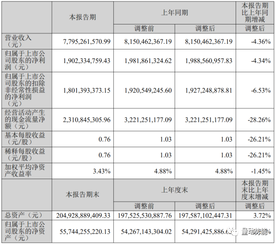 【中报】2023中报显示,公司主营收入77.95亿元,同比下降4.36%;归母净利润19.02亿元,同比下降4.34%;扣非净利润18.01亿元,同比下降6.53%;其中2023年第二季度,公司单季度主营收入41.02亿元,同比下降0.69%;单季度归母净利润10.52亿元,同比下降6.78%;单季度扣非净利润10.77亿元,同比下降1.04%;负债率36.2%,投资收益31.87亿元,财务费用9.6亿元,毛利率42.02%。
