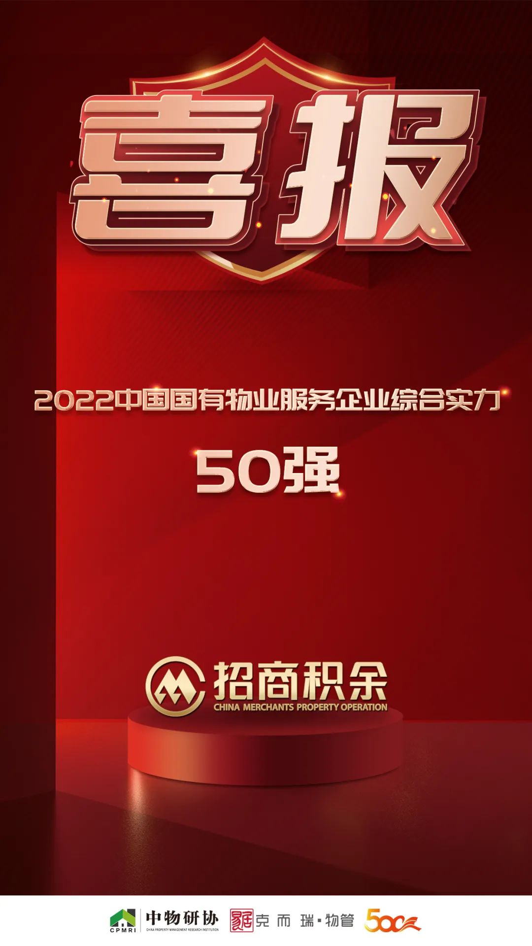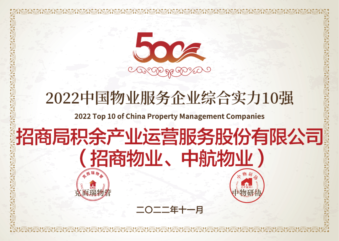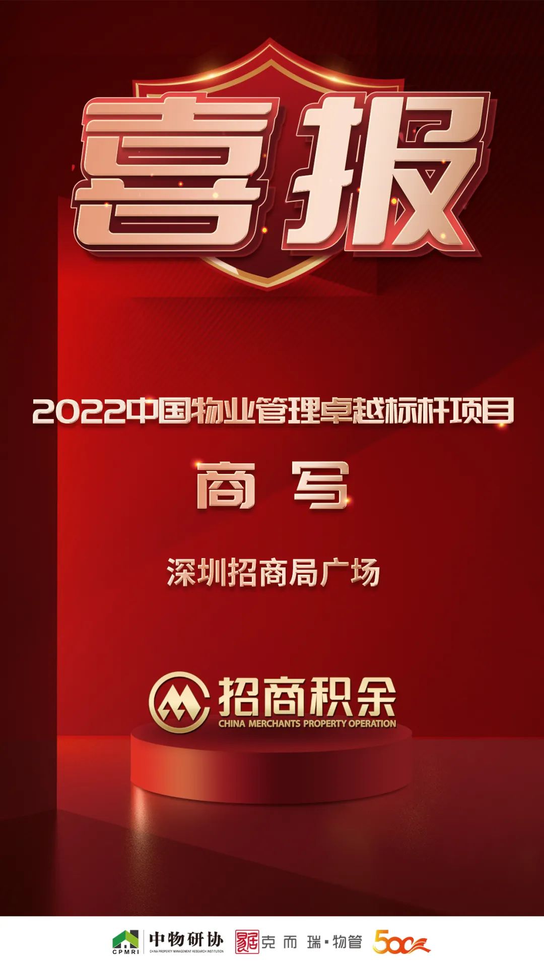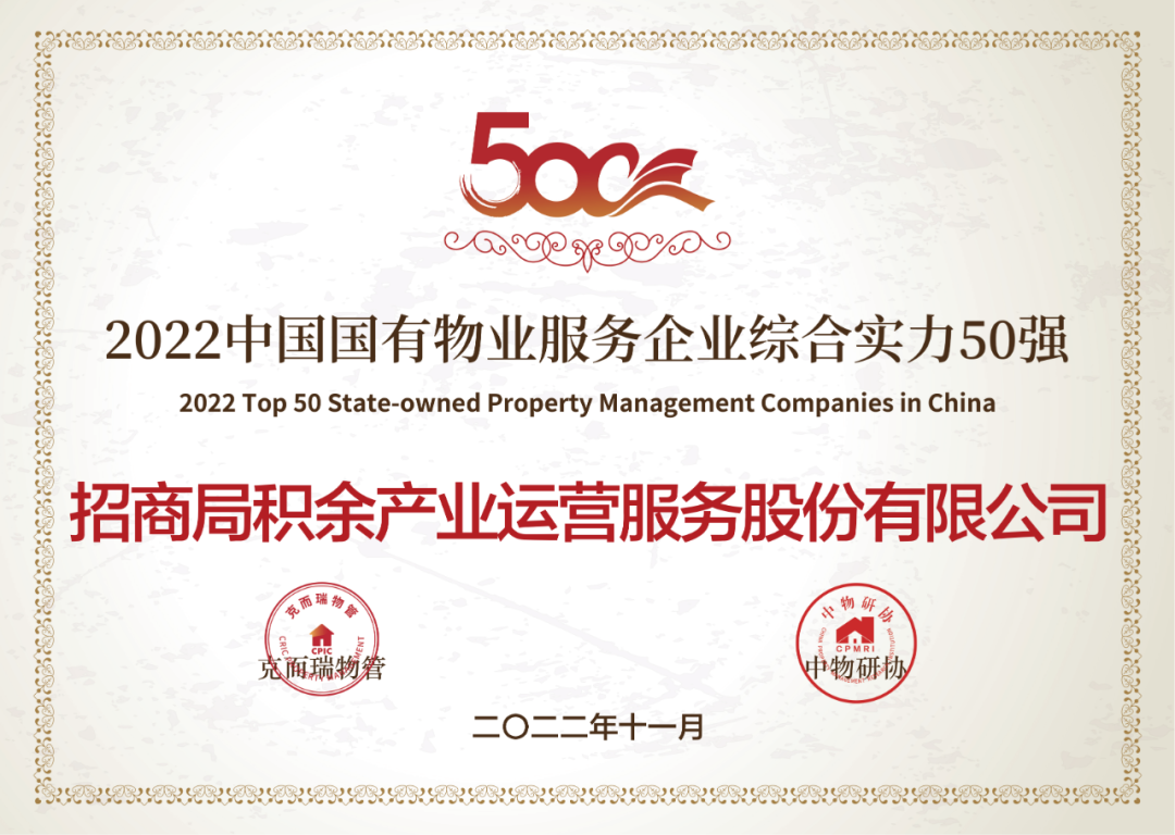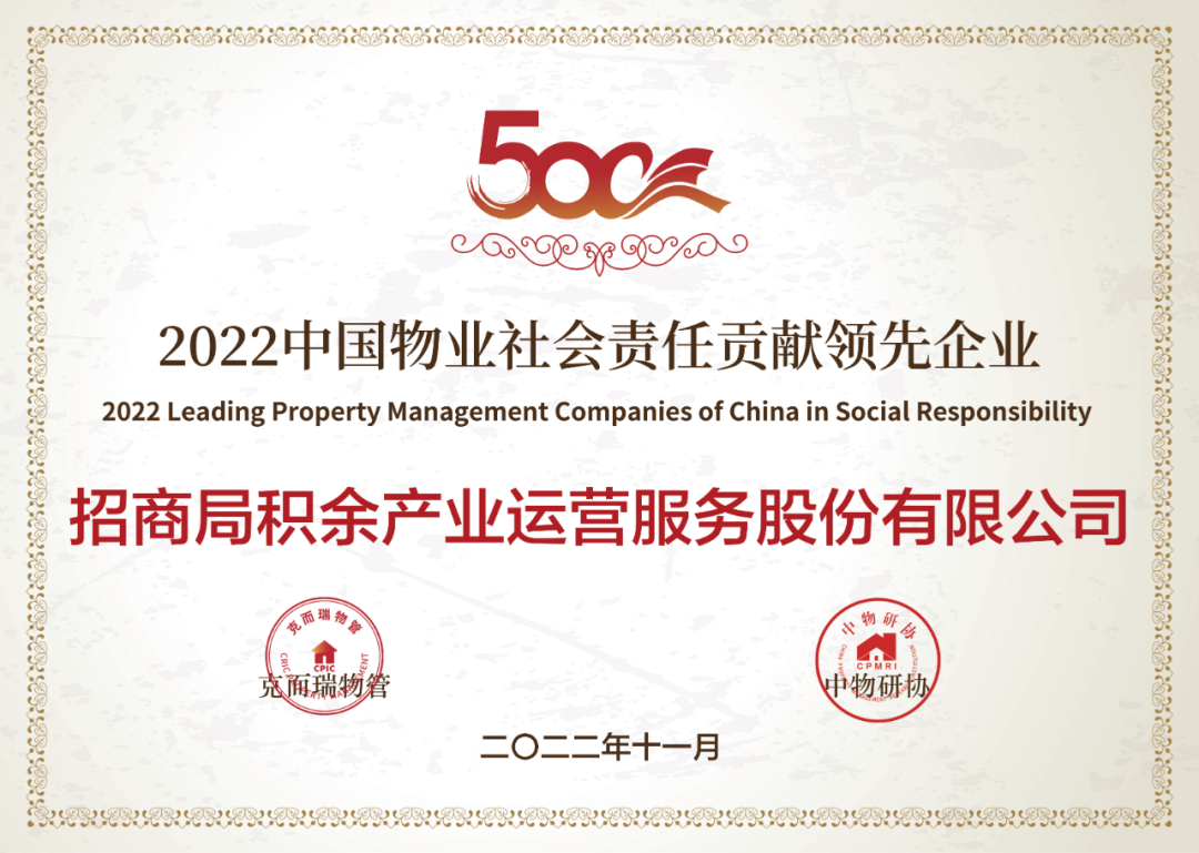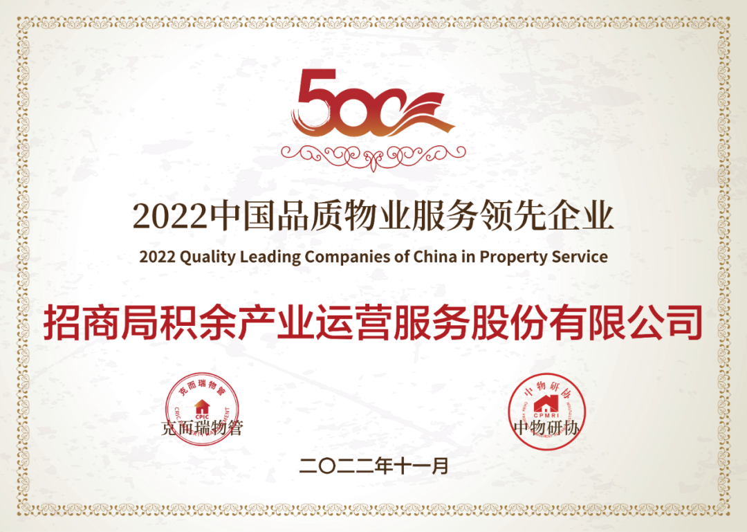 2022年11月1日,克而瑞物管、中物研协联合发布了《2022中国物业服务企业综合实力研究报告》。同期揭晓2022中国物业服务企业综合实力500强及相关榜单。招商积余荣获“2022中国物业服务企业综合实力500强”TOP4、“2022中国国有物业服务企业综合实力50强”TOP3、“2022中国学校物业服务领先企业”TOP2、“2022中国品质物业服务领先企业”TOP1、“2022中国物业社会责任贡献领先企业”、“2022中国物业管理卓越标杆项目”——深圳招商局广场。