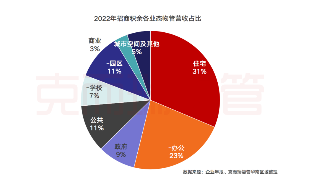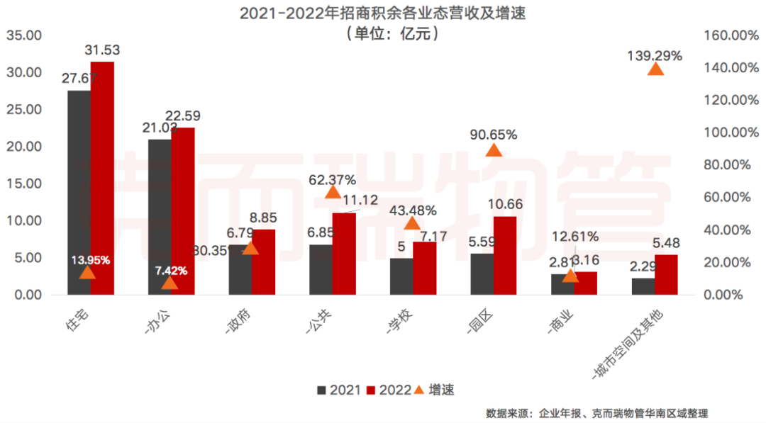 营收结构进一步优化,保持多业态综合服务能力,并且城市服务取得较大进展,基础物管营收增速达139%。从基础物业管理的营收来源来看,招商积余物业管理业务覆盖项目类型丰富,除住宅领域外,还包括办公、商业、园区、政府、学校、公共、城市空间及其他业态等非住宅领域。报告期内,招商积余基础物业管理的非住宅业态领先优势持续巩固,合计营收占基础物业管理收入的69%,其中公共业态项目包括医院、场馆、交通、颐养、公园等。从各业态营收增速上看,同比增速较快的主要是城市空间及其他和园区,增速分别达139.29%及90.65%,呈倍数增长。