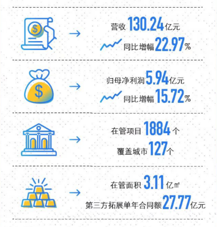 据其2022年年度报告披露,招商积余2022年营业收入达到130.24亿元,同比增长22.97%,归母净利润为5.94亿元,同比增长15.72%;还原政策性减免房产租金0.86亿元影响后,归母净利润较上年同期增长31.58%;管理规模达3.11亿平方米,同比增长10.82%,在管项目达1884个。2022年招商积余在100亿大基数上,践行稳健、有质发展的策略,实现年度业绩目标。