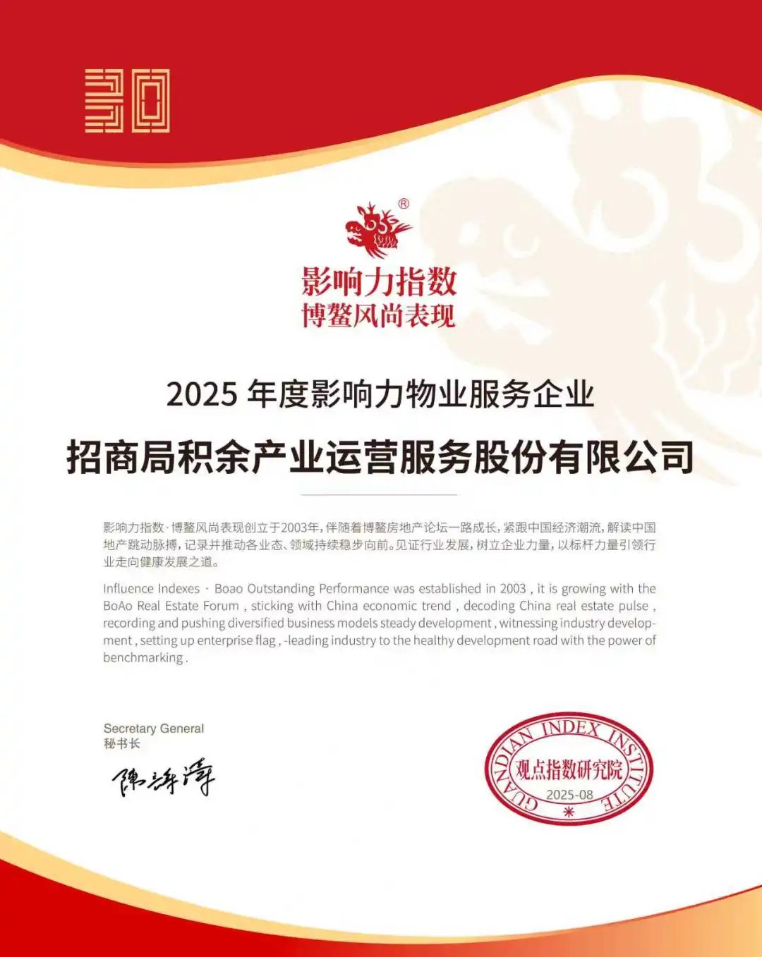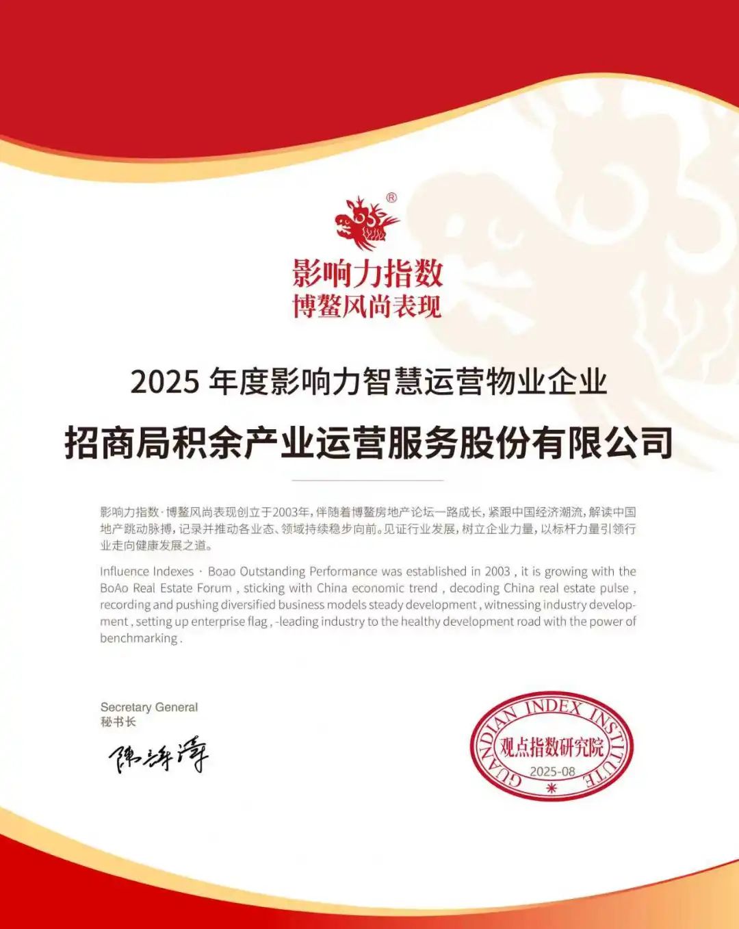 招商局积余产业运营服务股份有限公司(以下简称“招商积余”)凭借卓越的服务品质与领先的智慧运营能力,成功入选“影响力指数?2025年度影响力物业服务企业”及“影响力指数?2025年度影响力智慧运营物业企业”两大榜单,充分彰显其在行业内的综合实力与品牌影响力。