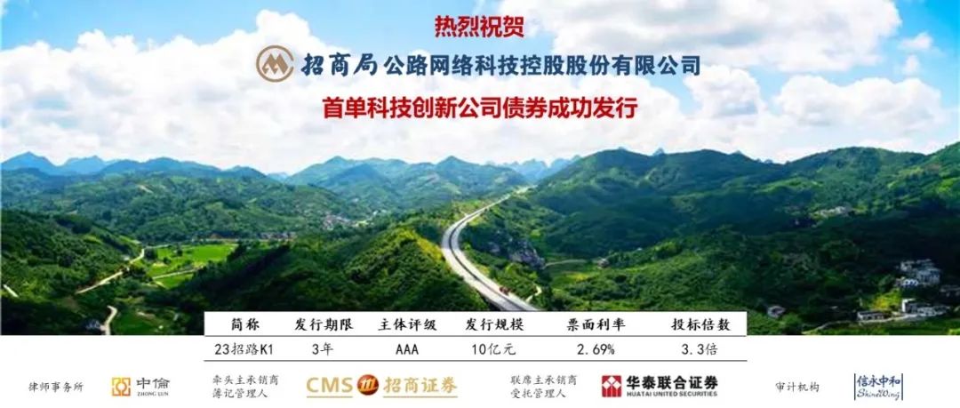 8月21日,招商局公路网络科技控股股份有限公司2023年度第一期科技创新公司债券在深圳证券交易所成功簿记发行,债券期限3年,发行规模10亿元人民币,债券票面利率2.69%。
