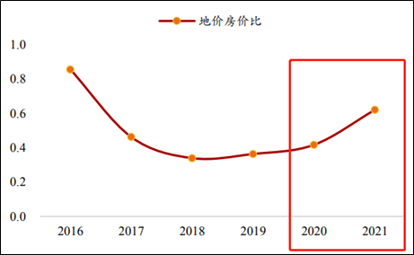 按照房地产行业开发预售开发进度的情况看,2021年结转的项目多是2019年左右的新增项目。而2020年、2021两年的新增项目的“地价房价比”已经出现了明显的增长,尤其是2021年,地房比超过60%,这对于招商蛇口来说,无异于埋下了持续“增收不增利”的隐患。