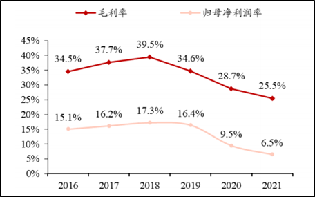 在招商蛇口增收不增利的背后,是公司项目毛利率出现了持续下滑的趋势。招商蛇口的毛利率从2018年的39.5%迅速下滑了14个百分点至2021年的25.5%,归母净利润也随着降低至6.5%的上市来最低点。在利润率下滑的情况下,公司加权ROE也降至9.54%的新低水平。