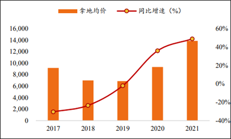 以毛利率顶峰的2018年为基数,招商蛇口的2021销售均价为22317元/平米,较2018年的20618元/平米仅增长8.2%。而同期的新增土地成本则增长超一倍之多,尤其是2021年招商蛇口14102元/平米(克而瑞数据),地价的高增长极大地压缩了公司的盈利空间。