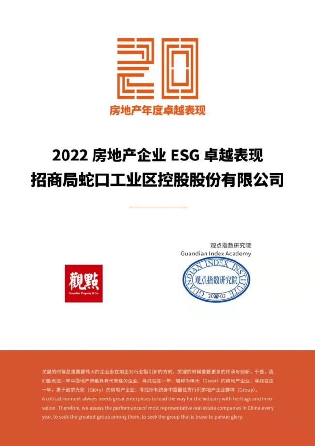 此外,招商蛇口还荣获“2022房地产卓越企业表现”、“2022房地产企业品牌价值卓越表现”、“2022房地产企业ESG卓越表现”、“2022房地产商业模式卓越表现”等多项单项奖。