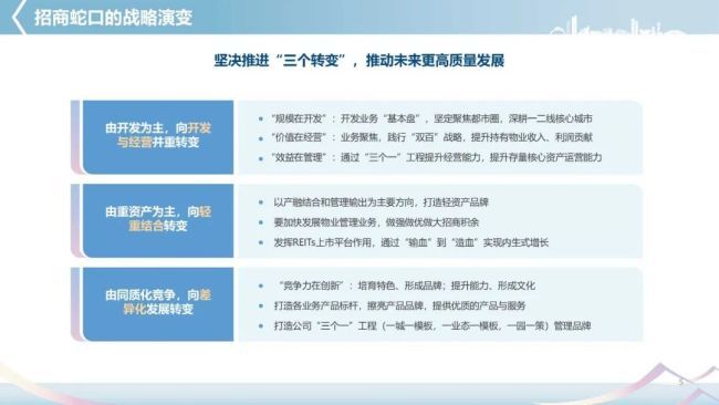 2021年,招商蛇口遵循当前房地产行业“规模在开发、价值在经营、效益在管理、竞争力在创新”的商业逻辑,持续推进公司转型,将“三个转变”融入战略,即由开发为主向开发与经营并重转变、由重资产为主向轻重结合转变、由同质化竞争向差异化发展转变,经营业绩稳步增长的同时,为高质量可持续发展注入源头活水。