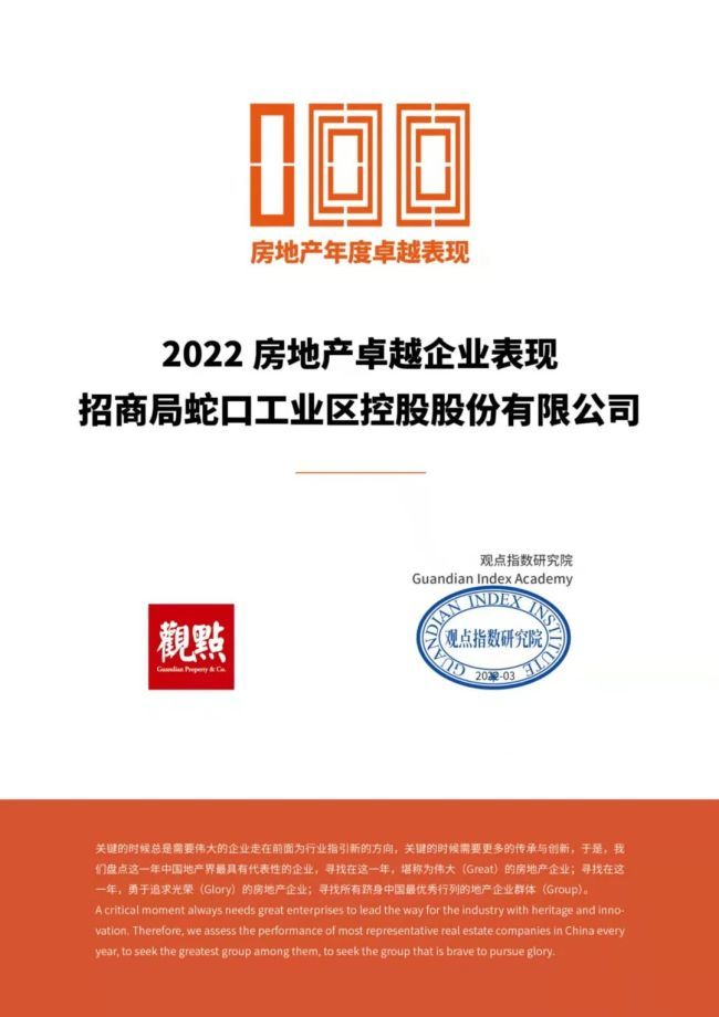 4月2日,“2022中国房地产百强企业研究成果发布会暨第十九届中国房地产百强企业家峰会”在京召开。招商蛇口凭借业内领先的综合实力、出色的市场表现以及稳健的可持续发展能力荣获“中国房地产百强企业”称号,位列第6位。