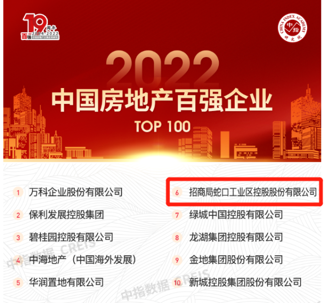 招商蛇口荣获“2022中国房地产百强企业”第6名