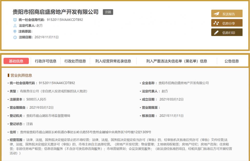 之后又成立了贵阳市招商启盛房地产开发有限公司,并参加了观山湖区党校地块的竞价,但目前贵阳市招商启盛房地产开发有限公司已注销。