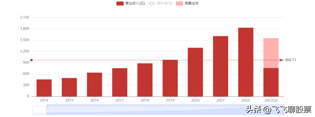 2014年,招商蛇口营业收入454.9亿元,到2022年实现营业收入1830亿元,保持连续8年正增长,2023年前三季度,实现营业收入758.3亿元,同比下滑15.26%。