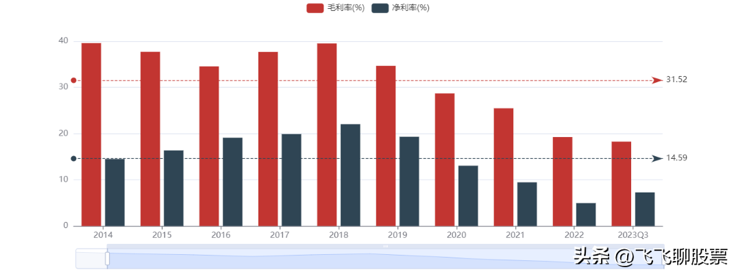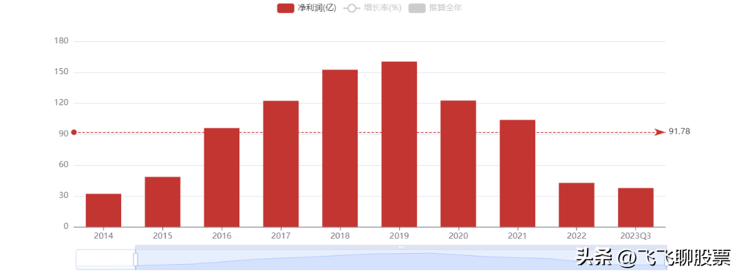 净利润同时期从2014年的32.05亿元增长至2019年的160.3亿元,但是2020年仅实现净利润122.5亿元,同比下滑23.58%,2021年仅实现净利润103.7亿元,同比下滑15.35%。2022年实现净利润42.64亿元,同比大幅度下滑58.89%,连续三年负增长,2023年前三季度,实现净利润仅37.69亿元。