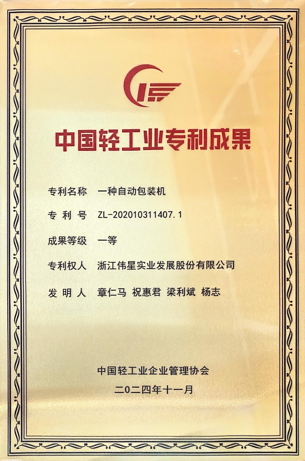 11月26日-27日,由中国轻工业企业管理协会主办的2024年中国轻工业企业家年会在河北白沟新城召开,大会正式公布了《2024年度轻工业专利成果评价结果》,其中伟星股份申报的发明专利“一种自动包装机ZL202010311407.1”荣获专利成果一等奖项目。