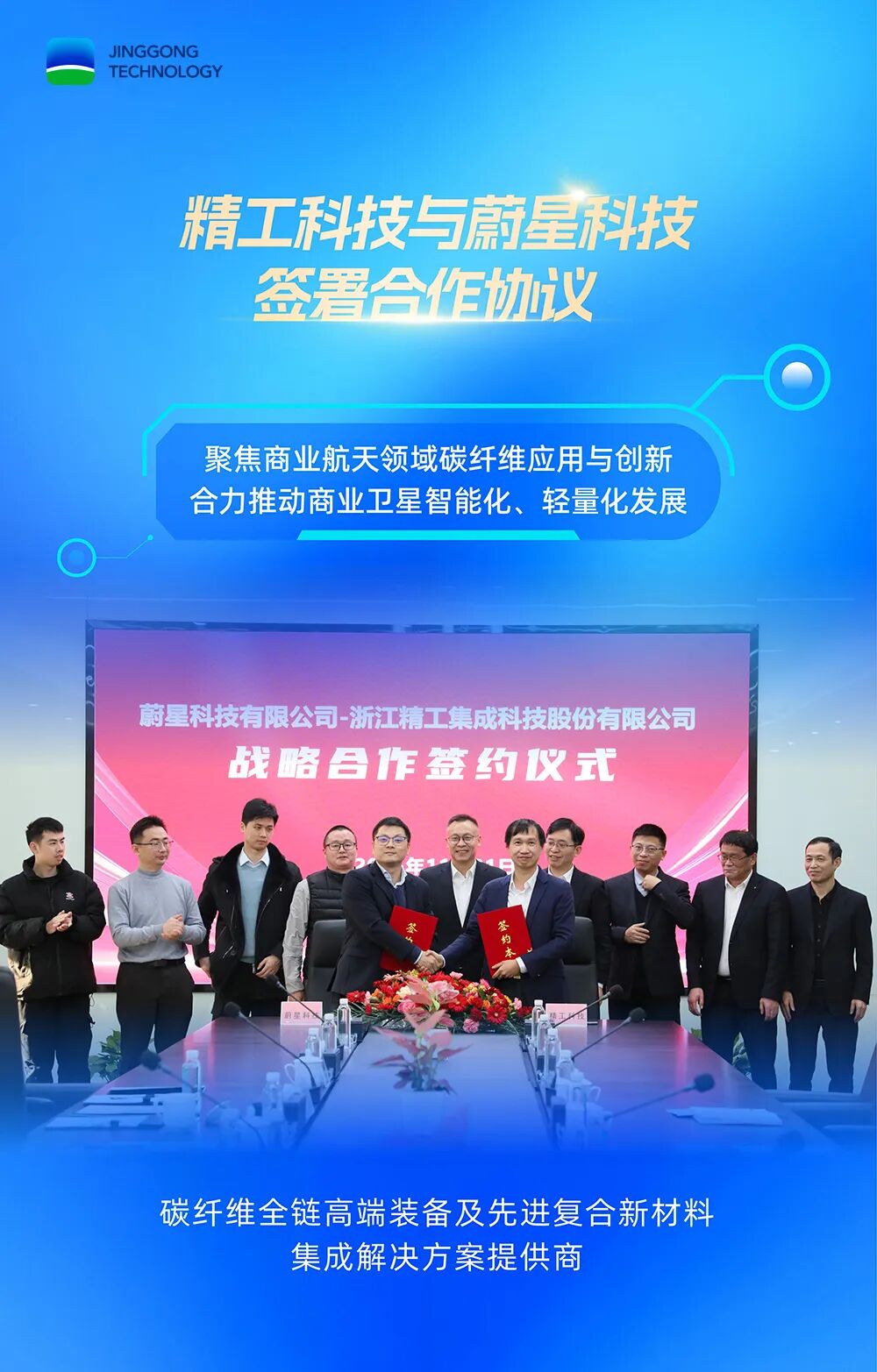 11月21日下午,浙江精工集成科技股份有限公司(简称“ 精工科技 ”)与 浙江蔚星空间科技有限公司 (简称“蔚星科技”)签署合作协议。双方将围绕商业航天领域展开深度协同与技术融合,共同推动高性能碳纤维复合材料在卫星制造上的应用与创新。
