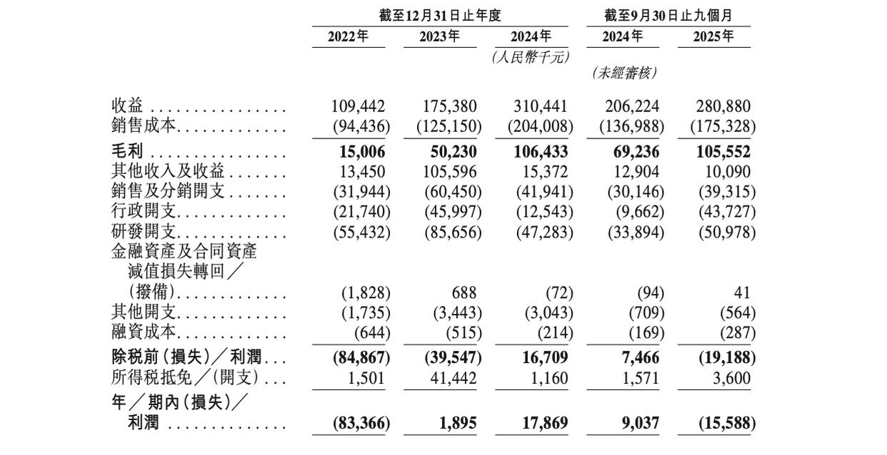 招股书显示,2022-2024年及2025年前三季度,华沿机器人的营收分别约1.09亿、1.75亿、3.10亿、2.81亿元;毛利分别约1500.6万、5023.0万、1.06亿、1.06亿元,毛利率分别为13.7%、28.6%、34.3%、37.6%;净利润分别约-8336.6万、189.5万、1786.9万、-1558.8万元,经调整净利润分别约-7053.5万、7146.8万、1786.9万、2445.3万元。